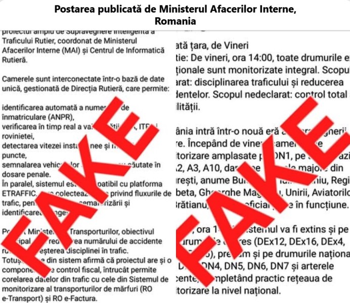 Ministerul Afacerilor Interne a explicat că un mesaj care circulă de câteva zile pe internet răspândește informații eronate despre un presupus plan de supraveghere extinsă a mobilității. În aceste postări, se susține în mod greșit că măsurile pentru siguranța rutieră sunt utilizate pentru a monitoriza traficul și spațiile publice.