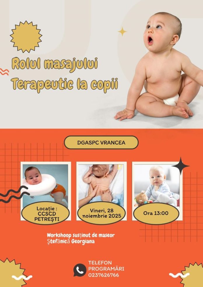 Direcția Generală de Asistență Socială și Protecția Copilului Vrancea pregătește un nou workshop în cadrul programului „Școala părinților”. Evenimentul are ca temă „Rolul masajului terapeutic la copii” și va avea loc vineri, 28 noiembrie 2025, începând cu ora 13:00.