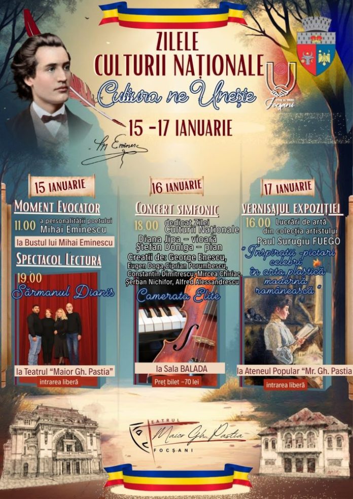 Primăria Municipiului Focșani organizează un eveniment cultural amplu pentru aniversarea a 176 de ani de la nașterea poetului Mihai Eminescu, marcând ziua de 15 ianuarie 2026 prin activități speciale. Conform %source%, programul include un moment comemorativ și un spectacol lectură, urmate de un concert simfonic dedicat Zilei Culturii Naționale, oferind focșănenilor o experiență culturală complexă.