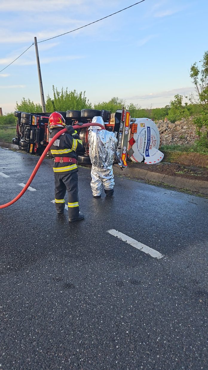 Un accident grav a avut loc astăzi în localitatea Mărășești, județul Vrancea, după ce un conducător auto a pierdut controlul asupra unei autocisterne plină cu etanol. Potrivit sursei de la fața locului, autocisterna s-a răsturnat pe E85, iar din nefericire, șoferul a murit.